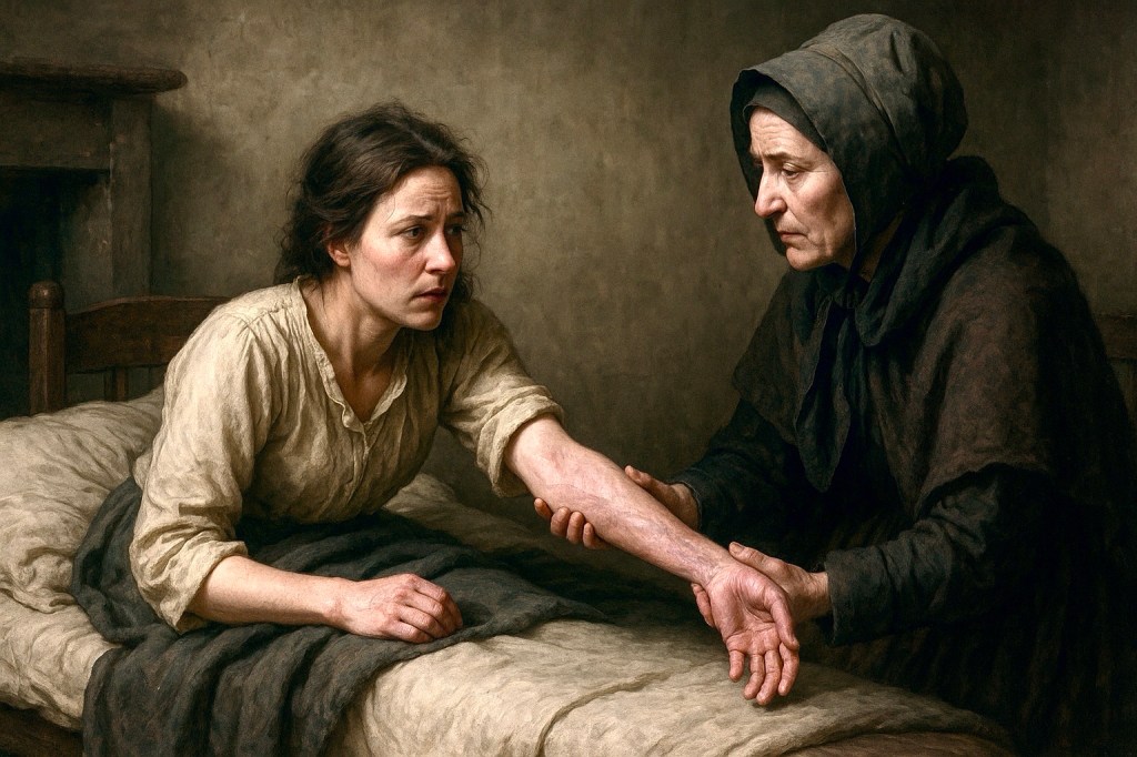 Gertrude’s journey to cure her arm brings her to a conjurer, which is as sensible as consulting a horologist about your aching tooth. The conjurer’s solution—touching the neck of a freshly hanged man – sounds like a macabre joke from a Victorian medical textbook. This bizarre remedy is Hardy’s way of saying, “You think your life’s weird? Hold my beer.”