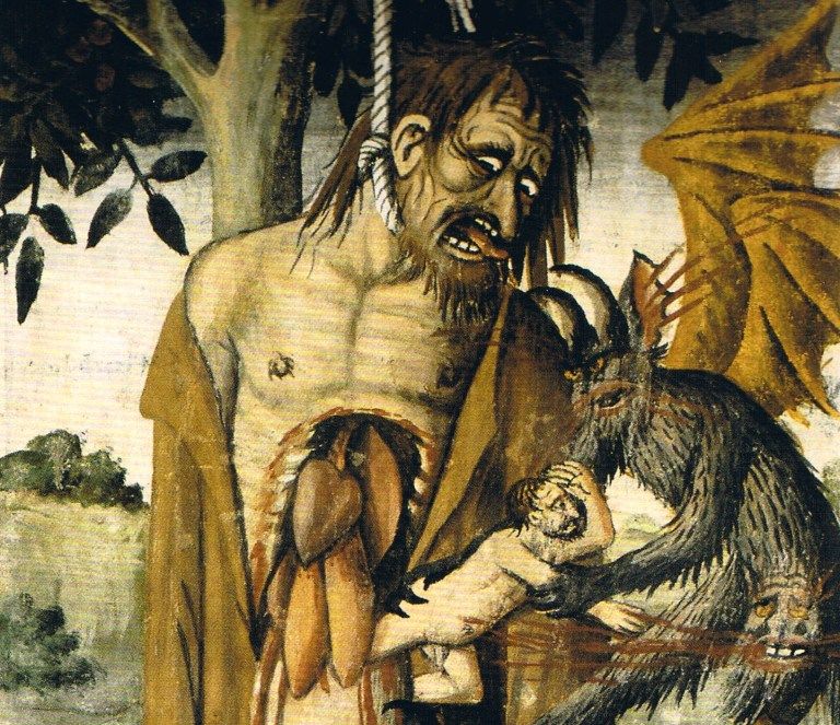 In this particular fresco, a small demon is depicted emerging from Judas’ belly, grasping his soul. This demon has exaggerated, grotesque features typical of medieval representations of evil spirits. The act of the demon pulling out Judas’ soul directly from his abdomen emphasises the belief in the tangible and immediate consequences of his sins.