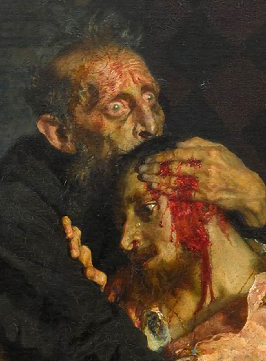 At the centre of the canvas are the figures of Ivan the Terrible and his dying son. Ivan IV, often depicted as a figure of overwhelming power and terror, here appears as a broken man. His eyes, wide with a mixture of shock, madness, and grief, stare out with a haunting intensity. The tsar’s hands, stained with blood, grasp his son in a desperate, almost futile attempt to reverse the irreversible. His face is a mask of agony, his mouth open in a silent scream, capturing the moment of his realisation and remorse.
