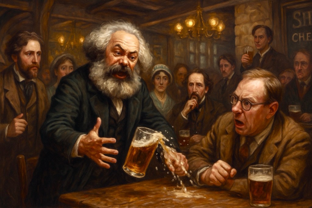 I’ve always thought Marx would have made an appalling pub landlord. He’d confiscate the dartboard, declare the crisps “the means of production,” and give the best seats to a committee. Within a week, there’d be queues down the street for watered-down lager, and you’d need a ration card to get a pork pie.
