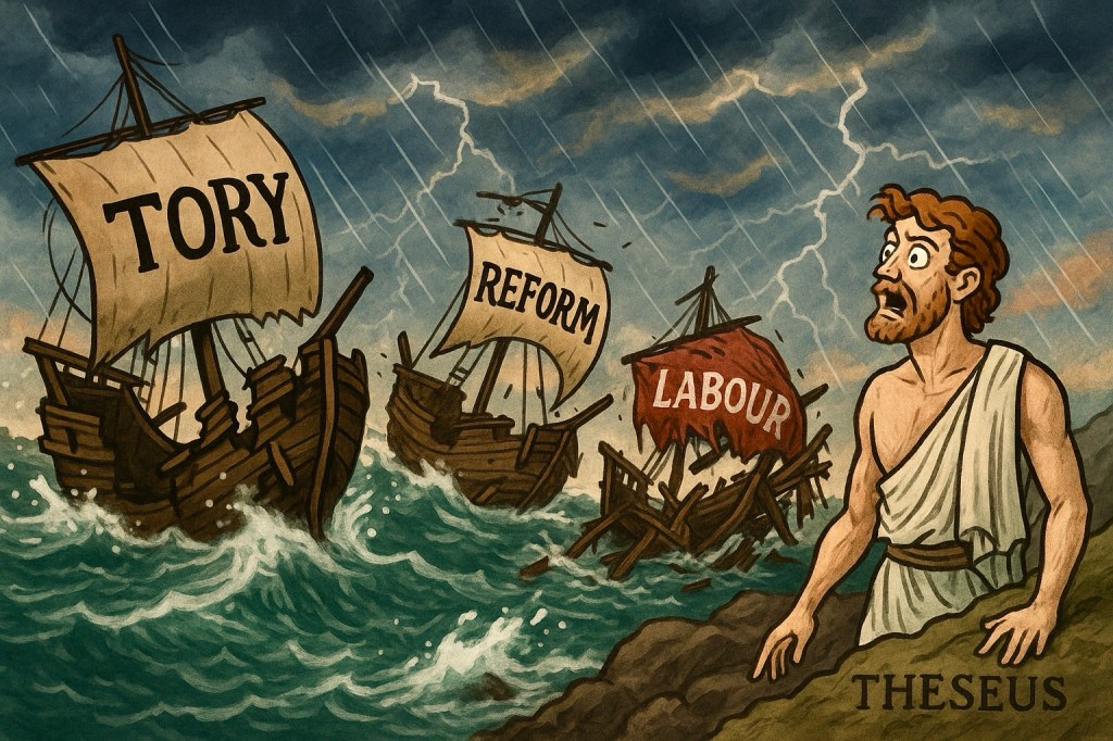 The paradox of Theseus, then, is no longer philosophical but existential. The Conservatives cling to a name scrawled on hollow planks. Reform hammers away, promising vigour but lacking sail. Labour sails a bureaucratic ark, oppressive in its socialism, joyless in its grey control, commanded by a captain who governs like a solicitor drafting contracts no one reads. The Britain that once carried liberty, faith, enterprise, and grit has been dismantled plank by plank, until its voyage is lost.