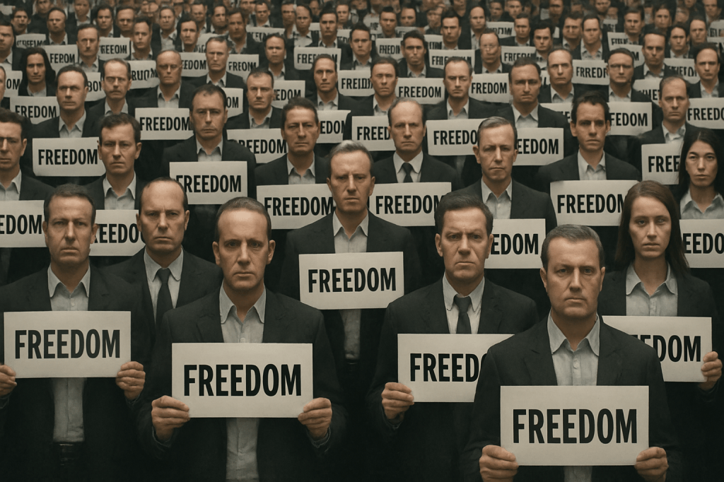But let’s not grow too grave. There’s comedy in the spectacle, as there always is when human beings insist they’re free. I picture the scene: a parliament of parrots, each squawking ‘liberty!’ in perfect synchrony; or a congregation where everyone bows in unison, muttering, ‘I am an individual.’ It’s Wilde’s aphorism inverted: ‘Be yourself; everyone else already is.’