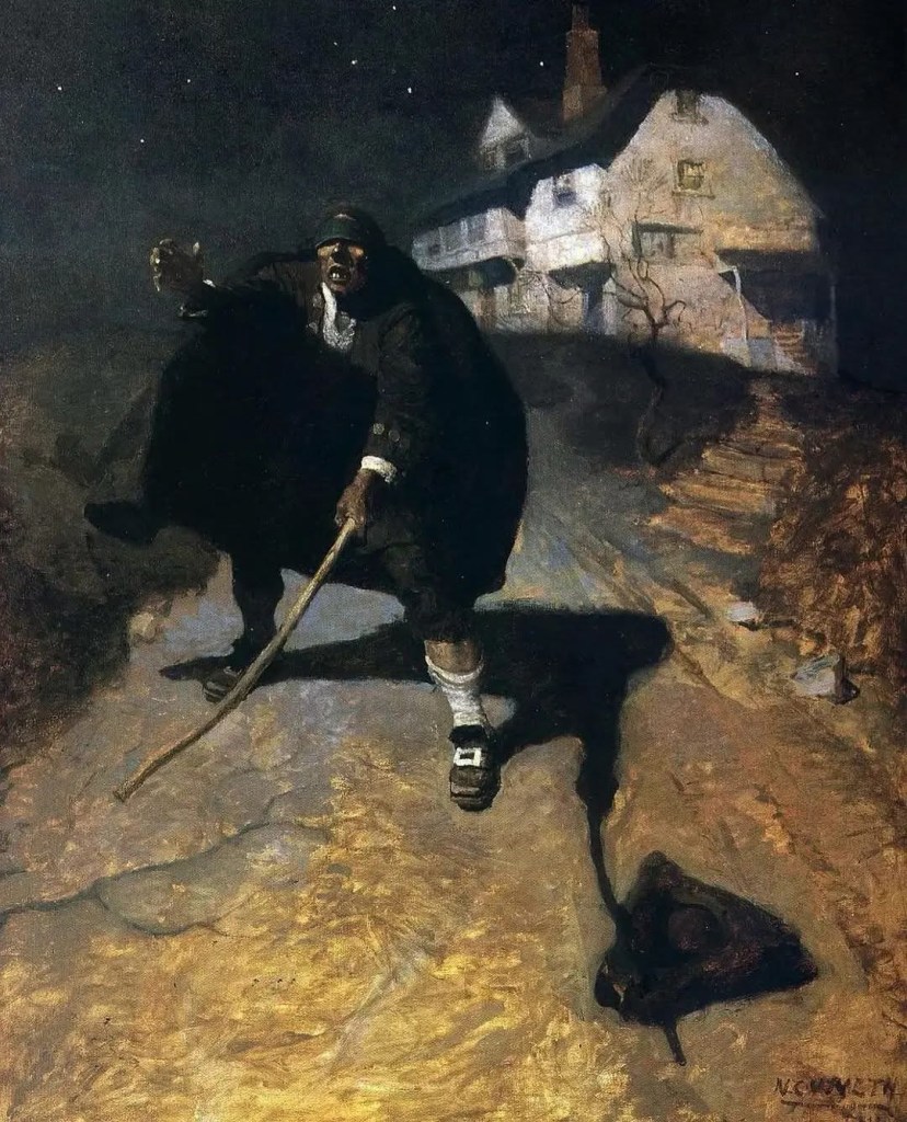 Notice the tension: he’s both threatening and precarious. His bent knees and hunched shoulders reveal fragility; one wrong step could send him sprawling. Yet that fragility is what sharpens the dread. Here’s no invincible demon, but a ragged man who has somehow become an instrument of doom. Shakespeare loved such figures – the Fool who speaks truth, the Blind Seer who reveals destiny. Stevenson, in his Scottish irony, allows Pew to terrify before letting him perish under hooves. Wyeth freezes him before that downfall: the eternal moment of terror, undiluted by comedy.