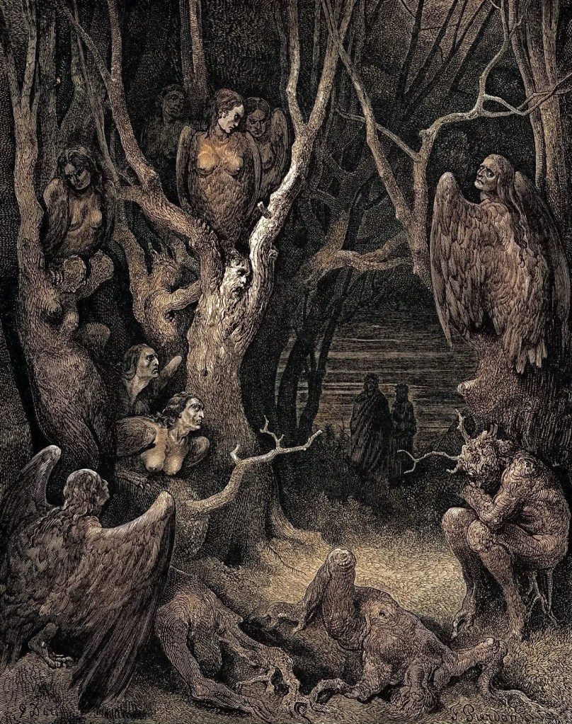 When I first looked at Doré’s Forest of Suicides, I thought of winter trees after a storm – those half-living skeletons that creak when the wind passes through, as if remembering they were once alive. But in Doré’s forest the trees don’t merely remember; they bleed. Each trunk is a person who denied their own body, and so was forced to keep it – in arboreal parody – for eternity.