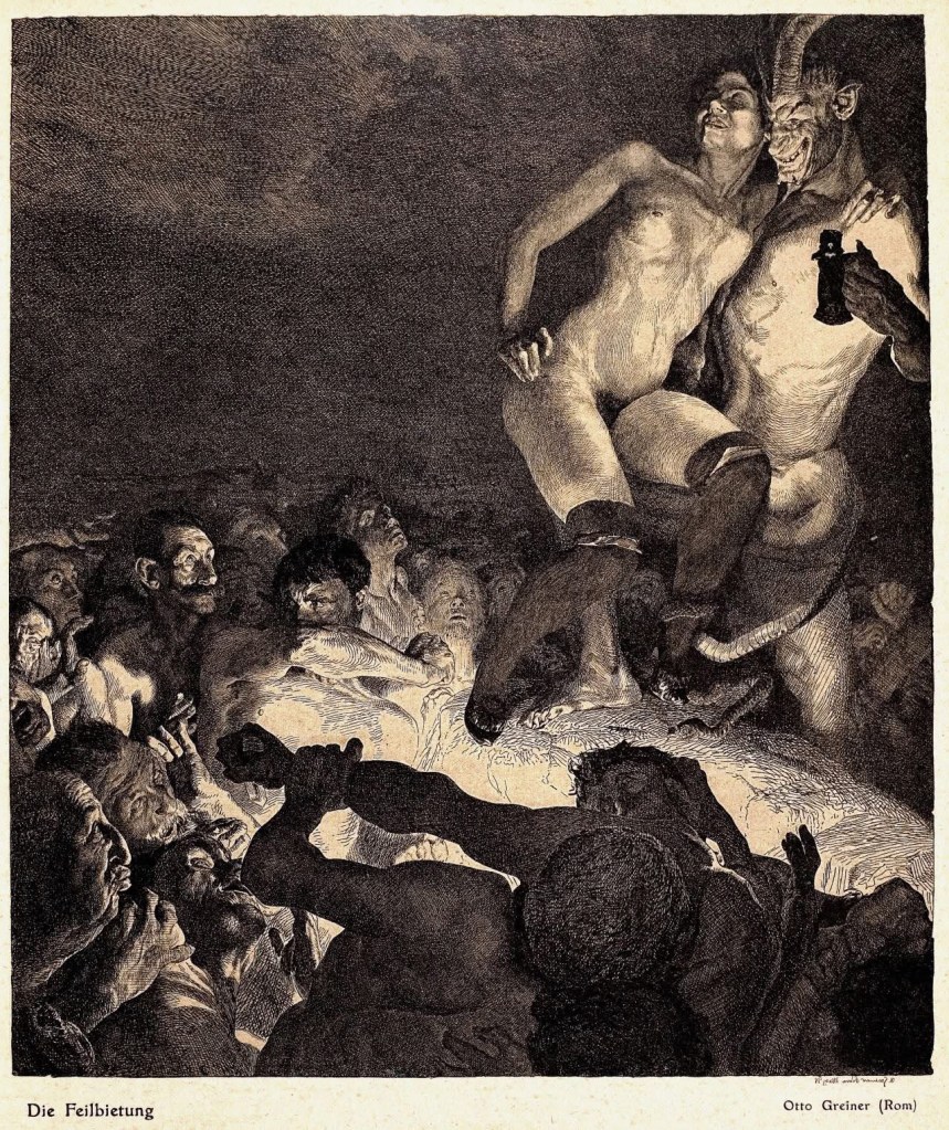 The devil’s always been a good salesman. From Eden’s orchard to Goethe’s study, from the witch-market of Faust’s Walpurgisnacht to the auction houses of our modern appetites, Old Nick has been peddling his wares with all the charm of a snake-oil merchant and the reliability of a banker. Otto Greiner’s Die Feilbietung – The Sale – shows us the spectacle in its purest form: the devil enthroned as auctioneer, a naked soul displayed like a prize heifer, and the mob below, eyes bulging, hands raised, eager to buy.