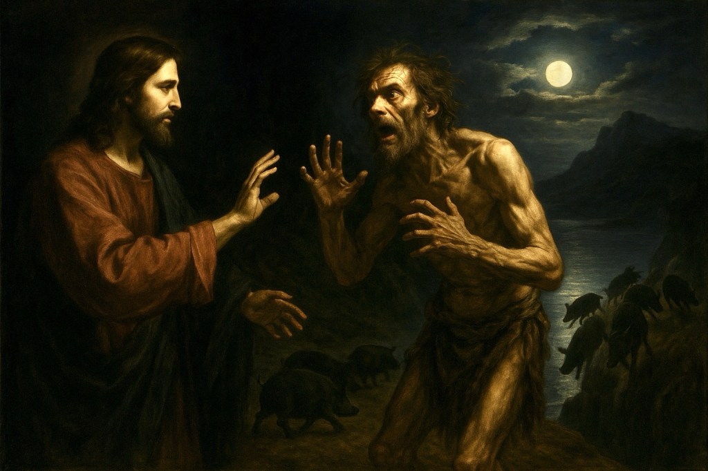 Some passages in Scripture read like thunder: sharp crack, sudden light, then a silence in which something ancient vibrates in the bones. The story of the Gadarene demoniac is one of them. A naked man shrieking among the tombs; chains snapped like wet wool; a village too afraid to bury its dead without one eye fixed toward the cliffs. It’s horror and holiness in the same breath — as though God walked into a nightmare simply to turn on the light.
